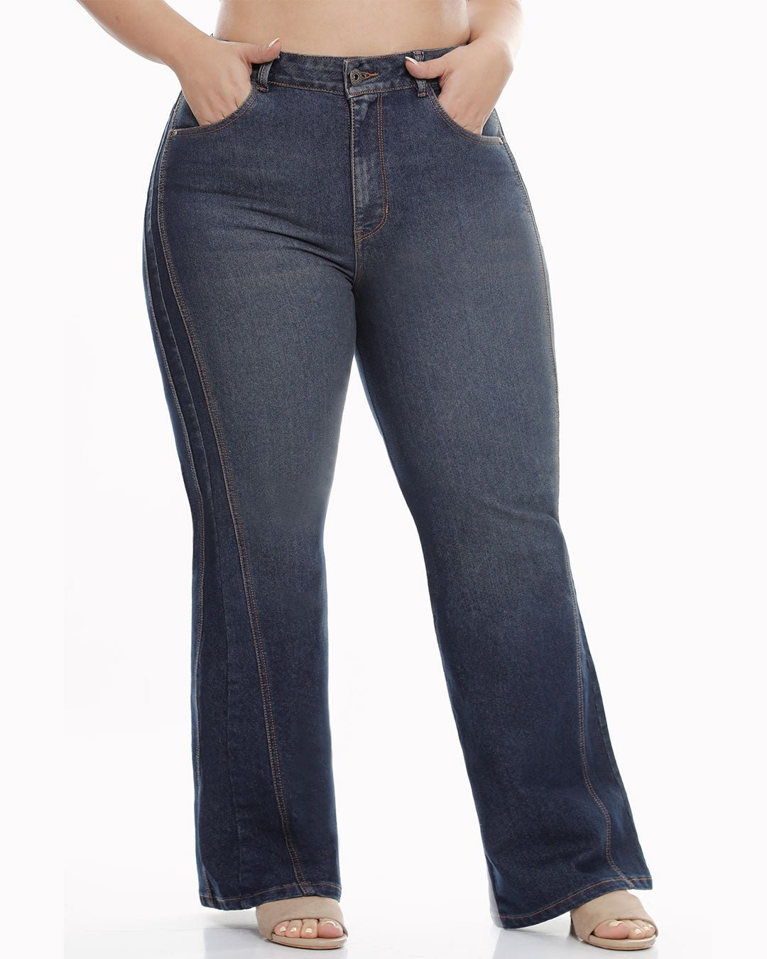 Jean bota flare con bolsillos funcionales y piedras brillantes en costados, pinza en el posterior. Tiro Alto. Tela Stretch. 66% Algodón 30.5% Poliéster 1.5% Rayon 2% Spandex La modelo mide 1.69 y usa talla 16.