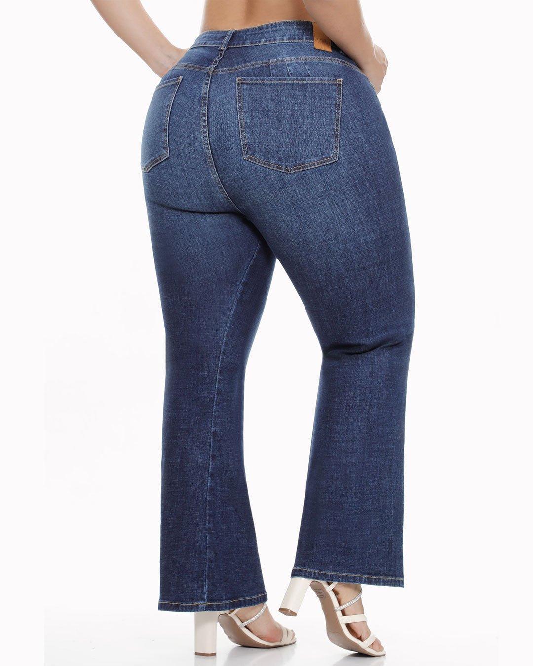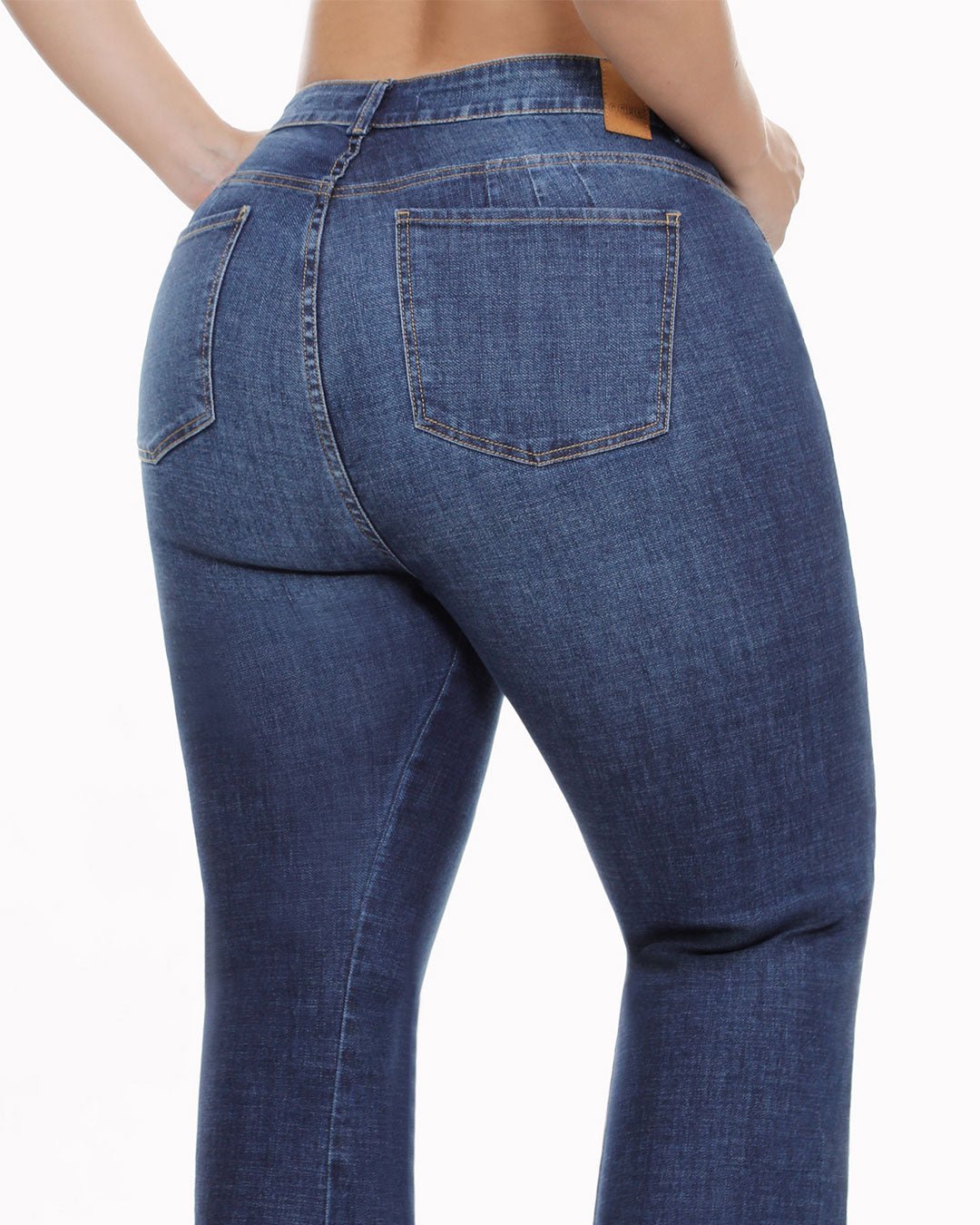 Jean bota flare con bolsillos funcionales, pinza en el posterior. Tiro Alto. Tela Stretch. 66% Algodón 30.5% Poliéster 1.5% Rayon 2% Spandex La modelo mide 1.69 y usa talla 16.