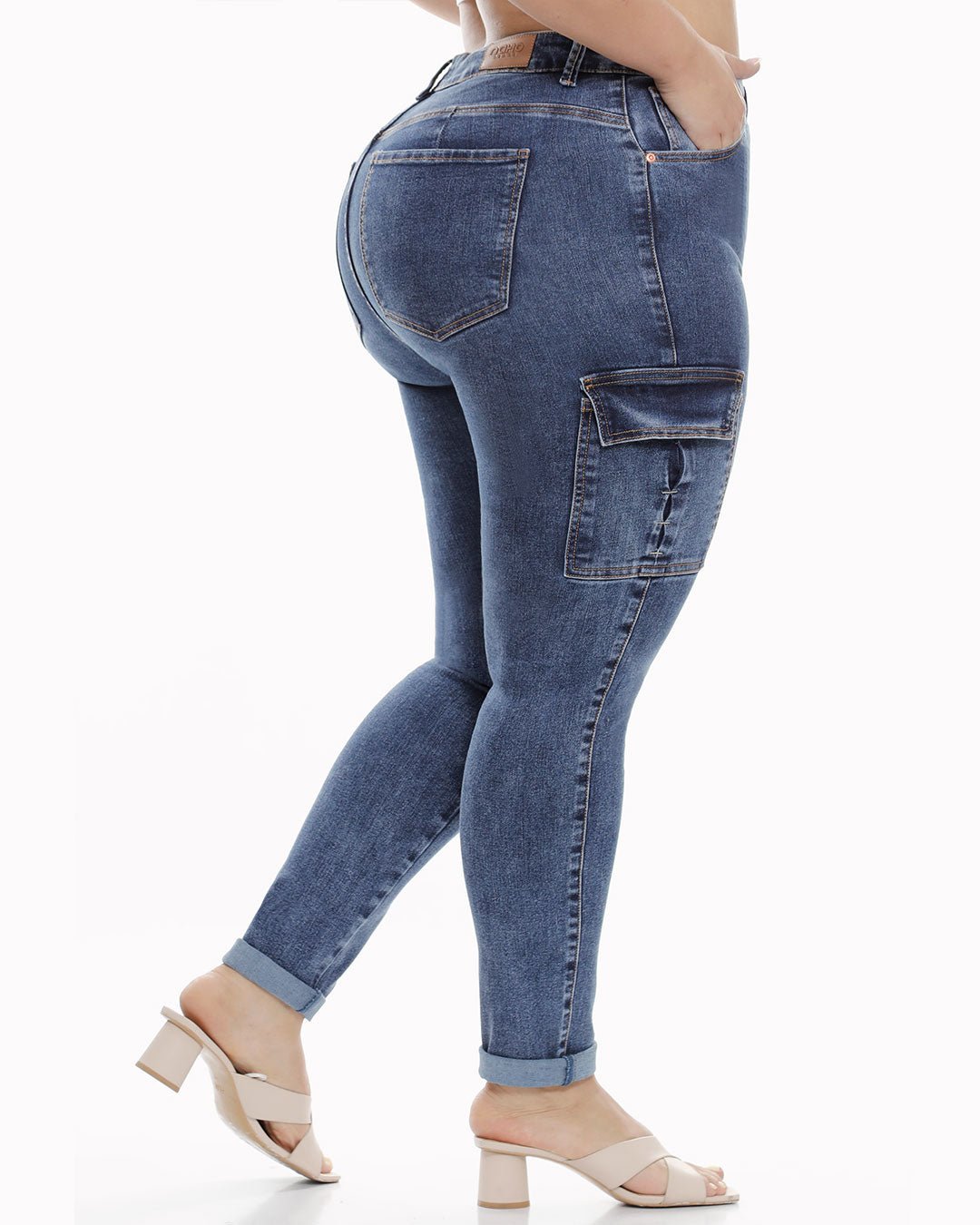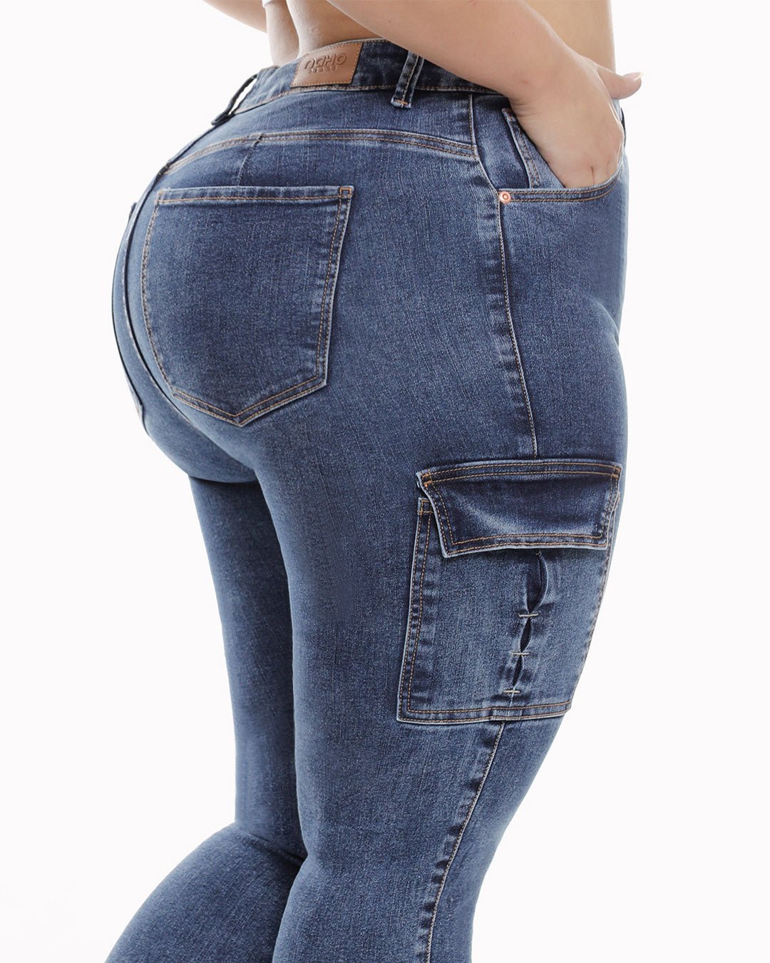 Skinny azul medio con bolsillos funcionales, pinza en posterior y bolsillos cargo con tapas en el costado, los bolsillos llevan detalle de presillas en contraste. Tiro Alto Tela stretch.