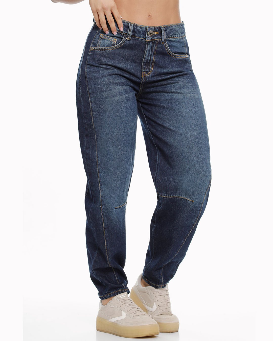 Mom fit azul medio con pretina resortada.Tiro Alto. Tela rígida.100% AlgodónLa modelo mide 1.67 y usa talla 8.