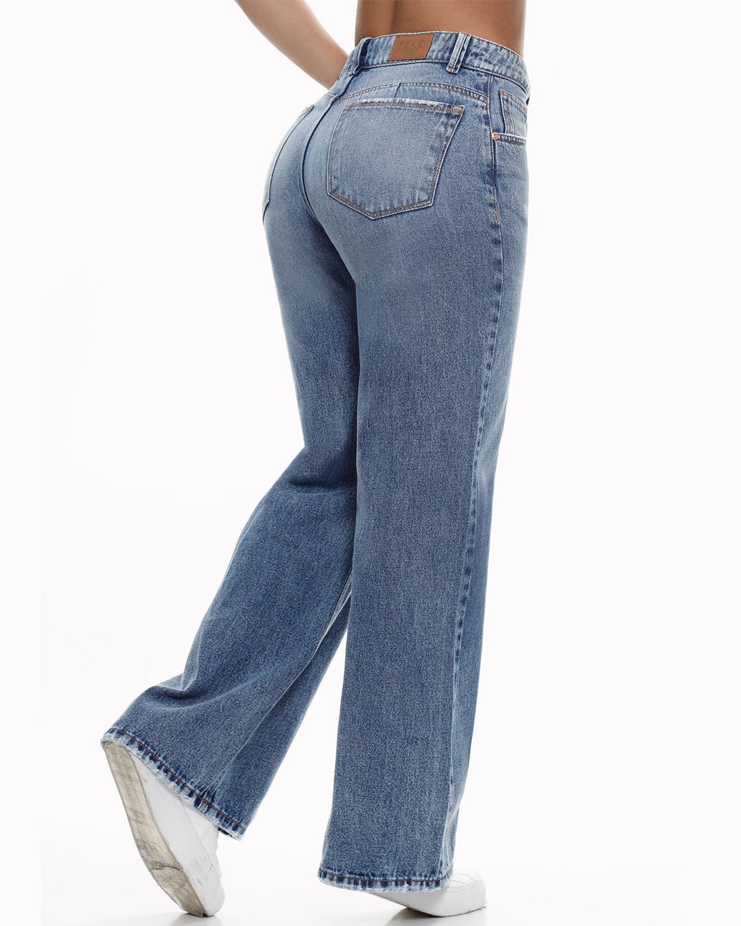 Jean wide leg azul con bolsillos funcionales. Pretina con diseño cruzado.