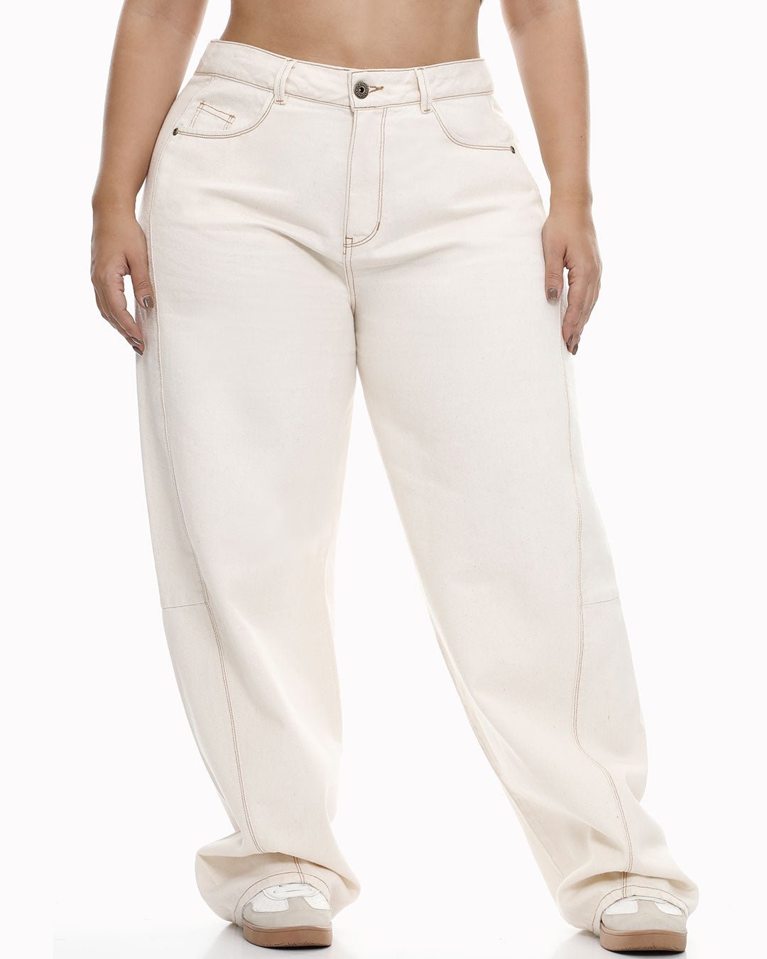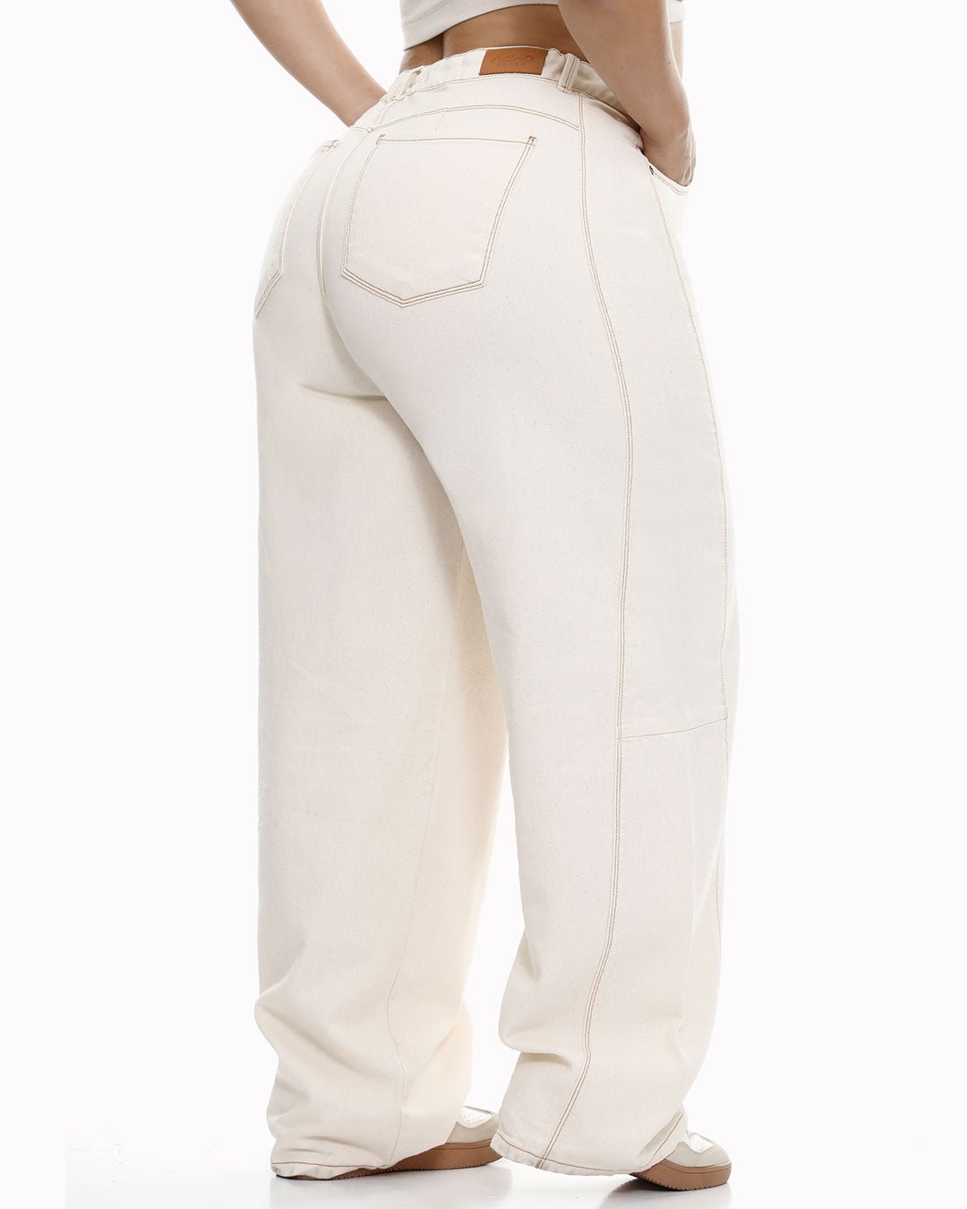 Baggy balloon silueta holgada, bolsillos funcionales, hilos de contraste y corte lateral. Cordón interno para ajustar cintura. Tela rígida. Tiro Alto. 100% Algodón. La modelo mide 1.69 y usa talla 16.
