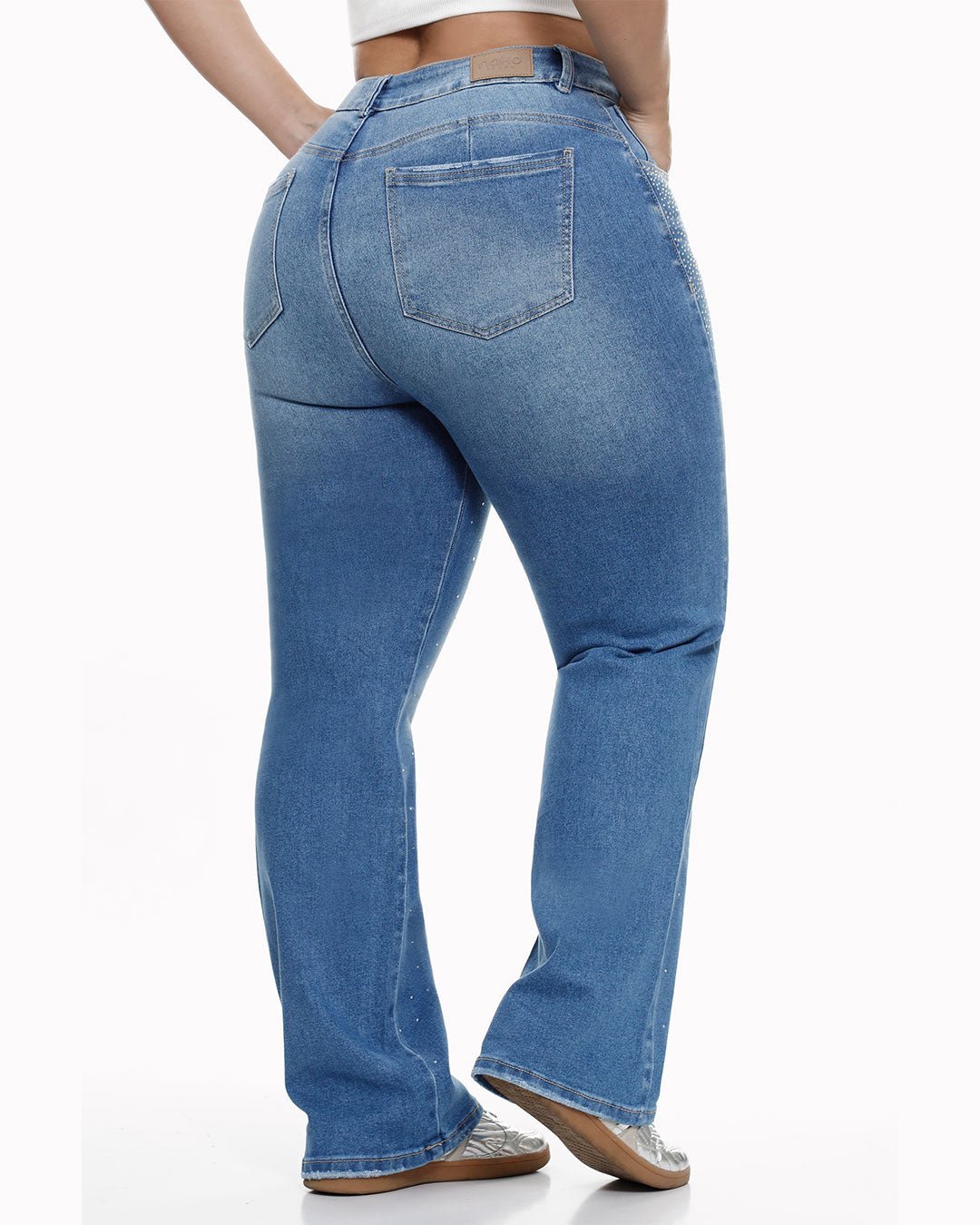 Jean bota recta con bolsillos funcionales y piedras brillantes en delantero, pinza en el posterior. Tiro Alto. Tela Stretch.70% Algodón26% Poliéster 3% Rayón2% SpandexLa modelo mide 1.69 y usa talla 16.