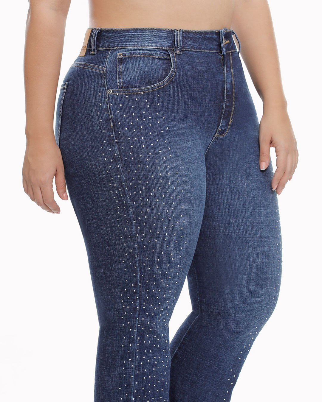 Jean bota flare con bolsillos funcionales y piedras brillantes en costados, pinza en el posterior. Tiro Alto. Tela Stretch.66% Algodón 30.5% Poliéster 1.5% Rayon 2% SpandexLa modelo mide 1.69 y usa talla 16.
