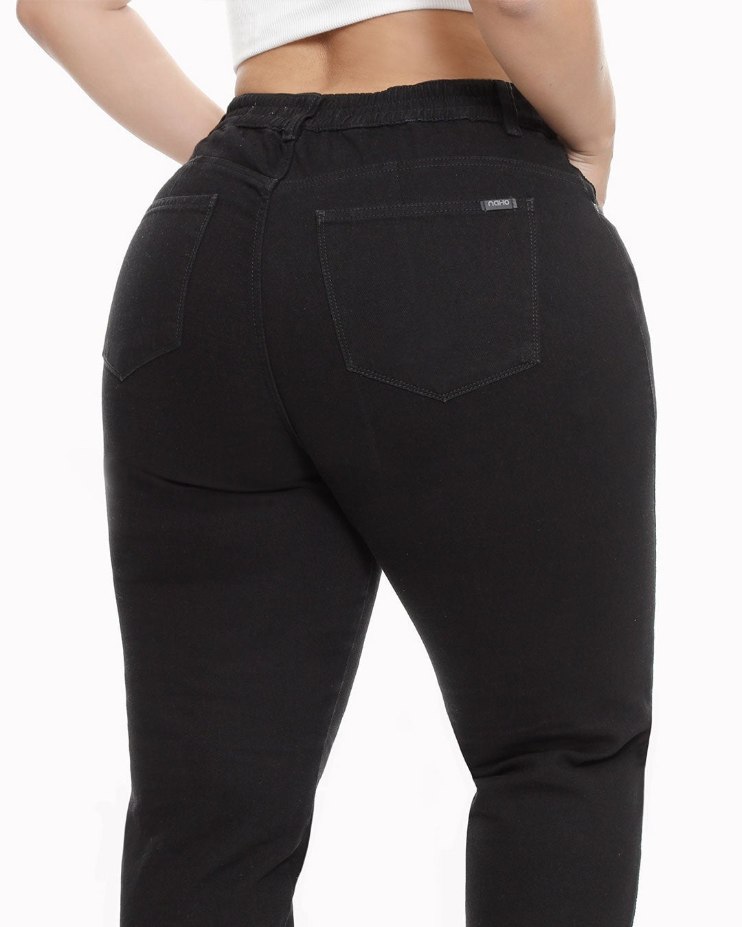 Mom fit talla plus negro con pretina resortada. Tiro Alto. Tela rígida.100% AlgodónLa modelo mide 1.69 y usa talla 16.