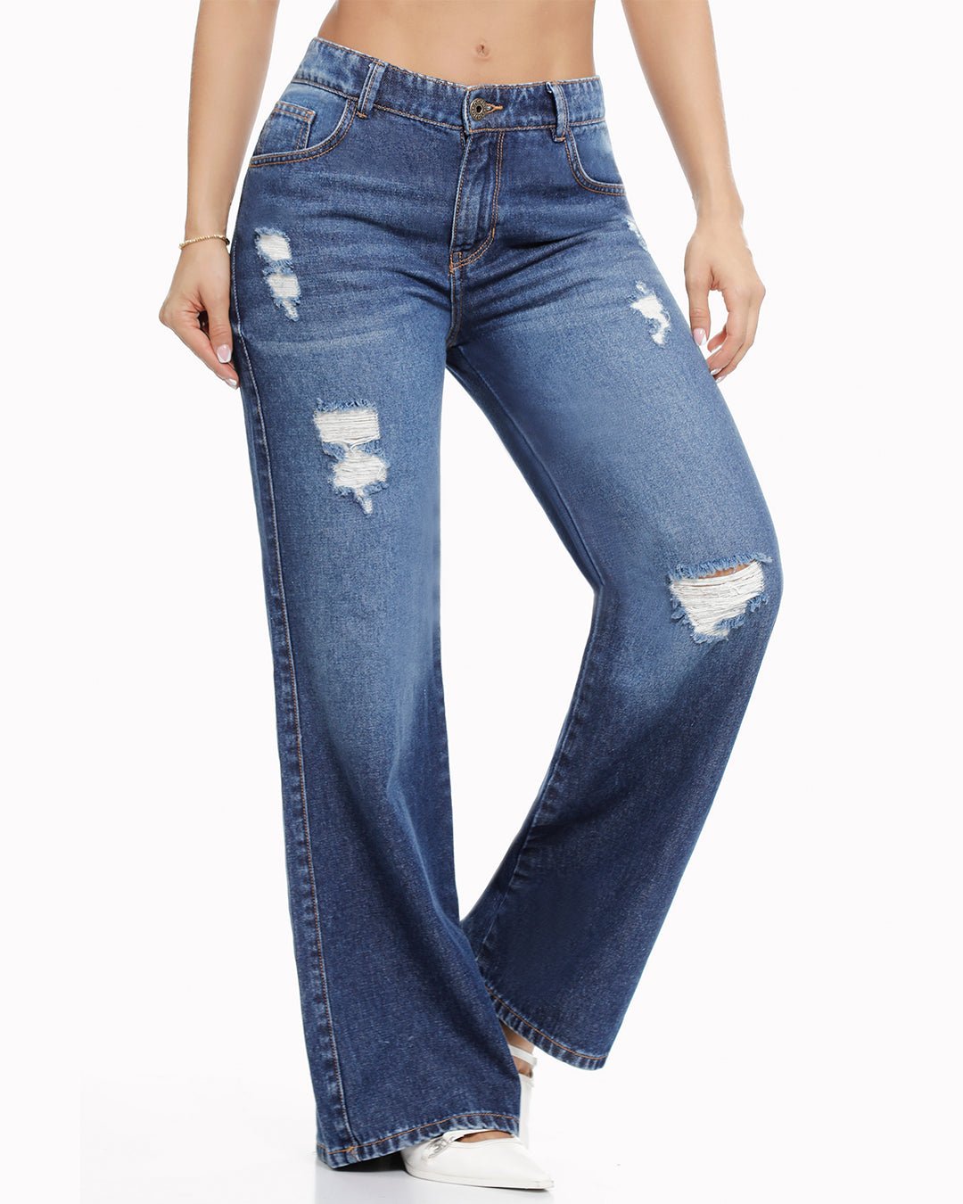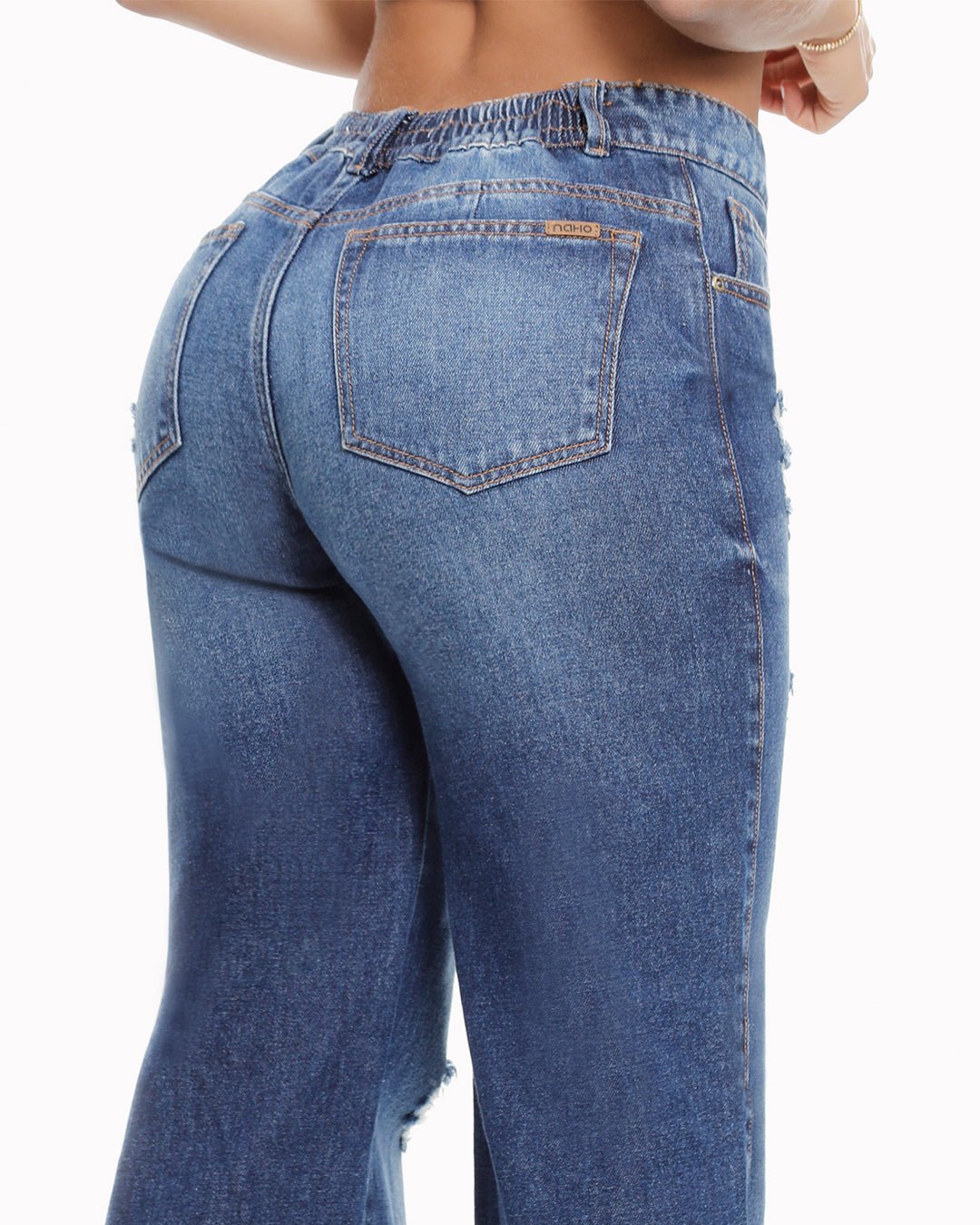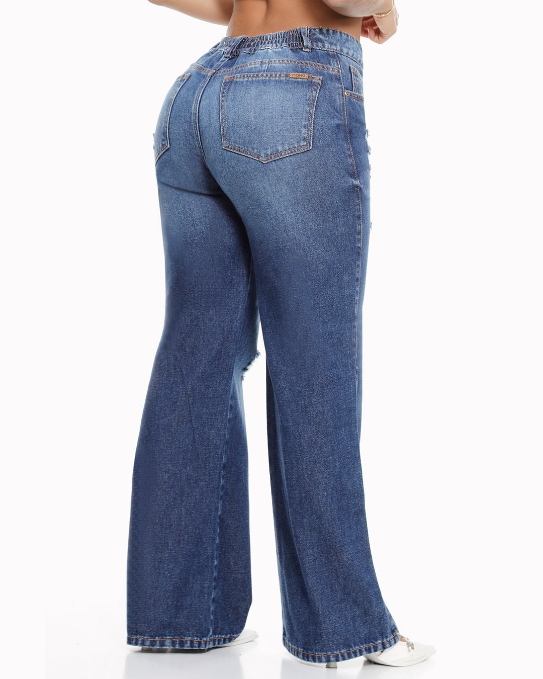 Wide leg clásico con bolsillos funcionales y pretina resortada, lleva pinza en el posterior, rotos en el frente. del jean. Tela rígida. Tiro Alto. 100% Algodón. La modelo mide 1.67 y usa talla 8.